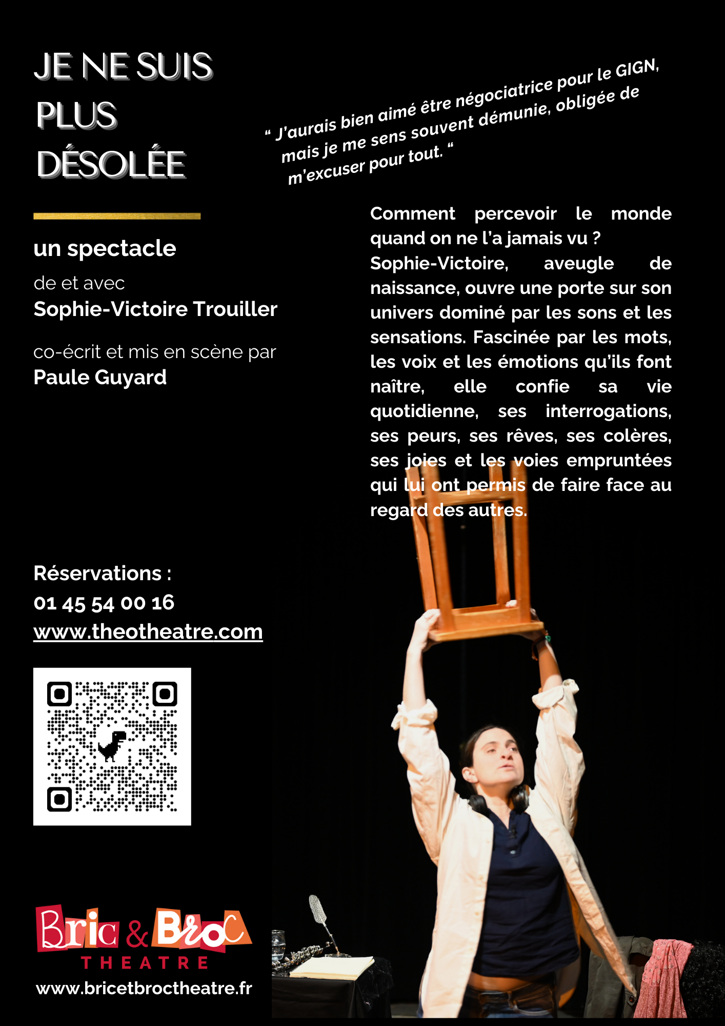 Comment percevoir le monde quand on ne l’a jamais vu ? Sophie-Victoire, aveugle naissance, ouvre une porte sur son univers dominé par les sons et les sensations. Fascinée par les mots, les voix et les émotions qu’ils font naître, elle confie sa vie quotidienne, ses interrogations, ses peurs, ses rêves, ses colères, ses joies et les voies empruntées qui lui ont permis de faire face au regard des autres.